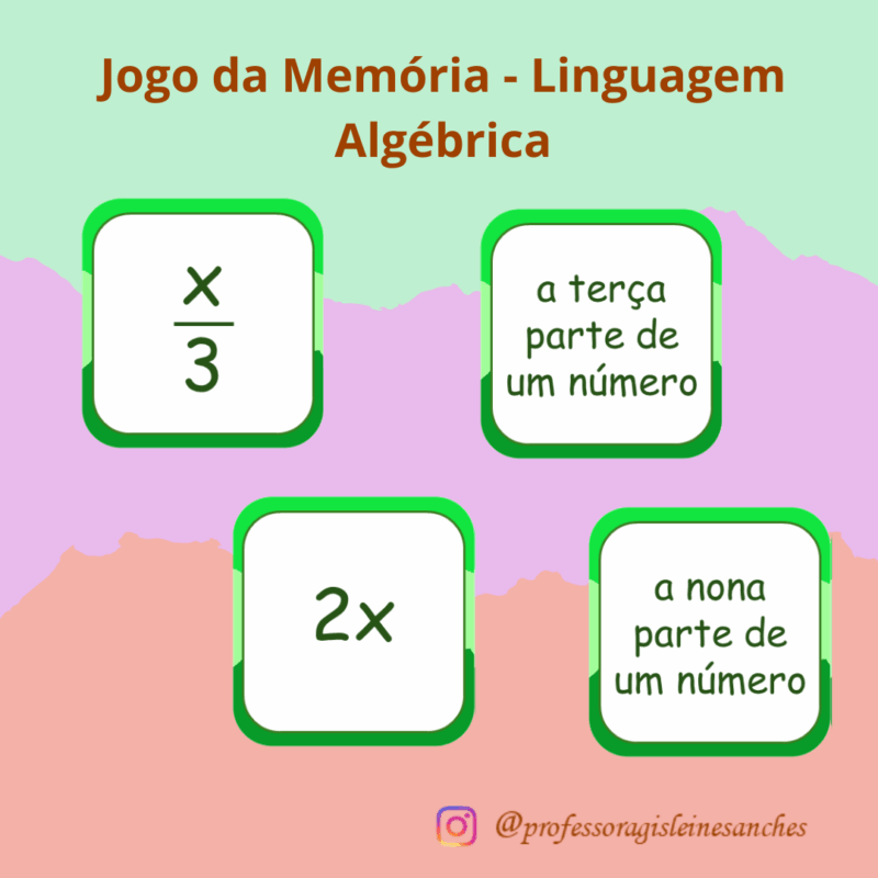 Este jogo da memória foi cuidadosamente elaborado para introduzir e fixar expressões algébricas de forma concreta e visual. Os alunos devem parear expressões do tipo “o dobro de um número” com sua forma algébrica (ex: 2x), desenvolvendo a compreensão dos termos matemáticos como dobro, triplo, quádruplo, metade, terça parte, entre outros.